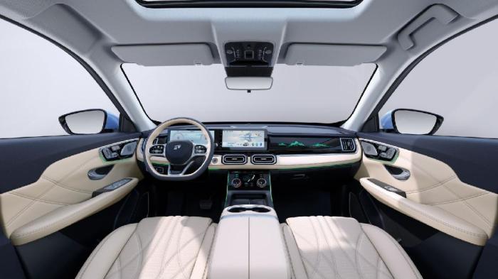 内饰方面,山海L7的配置非常丰富,整体视觉效果简洁时尚。中控台采用简约造型,双拼色配色带来温馨感觉。12.3英寸中控屏搭载智能智能网联系统,操作流畅,功能丰富。座椅采用皮质材质,包裹性到位,提供了良好的支撑和包裹,长途旅行也能久坐不累。此外,山海L7还提供了可选装的二排车载冰箱,功能齐全,极具实用性。